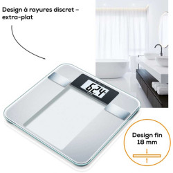Contrôlez votre poids en toute simplicité ! Le pèse-personne avec grand écran LCD affiche vos valeurs de poids, graisse et eau corporelles et taux de muscle et calcule même votre IMC.