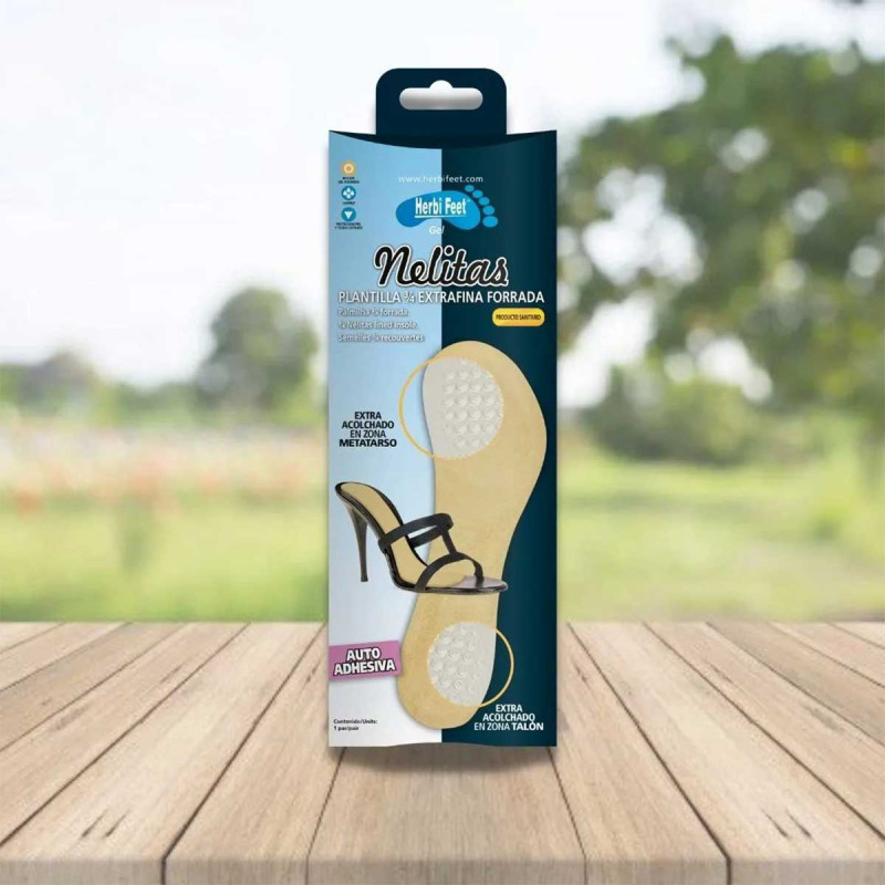 La semelle intérieure ¾ Nelitas, doublée de tissu beige, est conçue pour soulager la douleur dans les zones métatarsiennes et du talon, évitant ainsi la formation de callosités et de dureté. Extra fin.