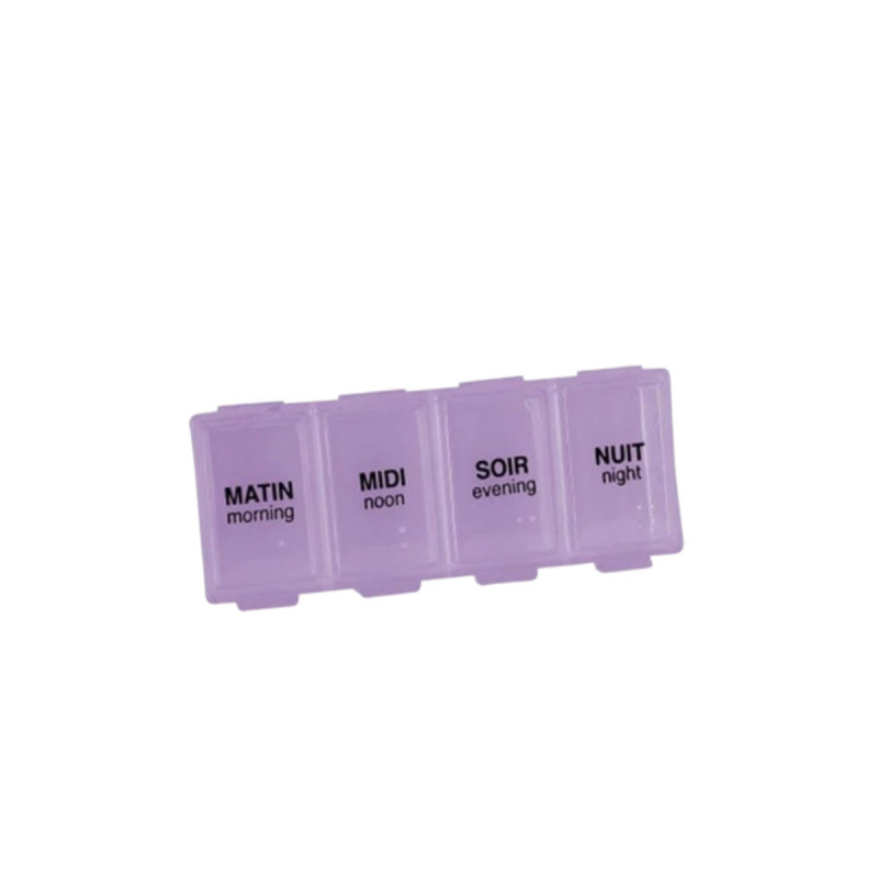 Il se présente sous la forme de 4 compartiments à cases fixes correspondant à une posologie pouvant inclure une prise le le matin, une le midi, une le soir et une dernière la nuit. Chacune de ses quatre cases est suffisamment grande pour accueillir plusieurs comprimés et dispose d'un couvercle à glissière qui empêche tout chute et perte de médicament au cours d'un déplacement.