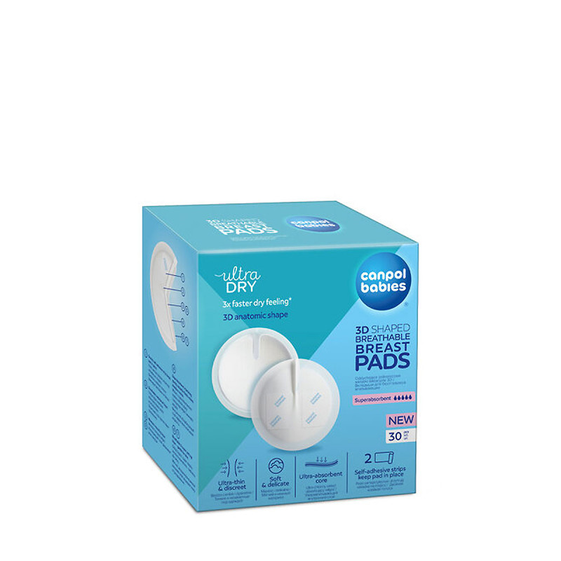 Les coussinets d'allaitement ultra absorbants Canpol babies offrent une protection et une sensation unique de sécheresse et de fraîcheur 3 fois plus rapide de jour comme de nuit. Ils sont très fins, grâce à quoi ils sont discrets et invisibles sous les vêtements. Les coussinets d'allaitement comportent 7 couches de protection, dont un insert ultra absorbant qui absorbe rapidement les liquides et retient l'humidité à l'intérieur du coussinet pendant longtemps. La couche supérieure souple est douce pour la peau et respirante, permettant à la peau de respirer librement et n'irrite pas les seins sensibles. La forme anatomique 3D augmente le confort de port et permet au coussinet de s'adapter parfaitement à la forme de la poitrine. La double bande adhésive maintient le coussinet en place, l'empêchant de bouger à l'intérieur du soutien-gorge, protégeant ainsi les sous-vêtements et les vêtements de la saleté.