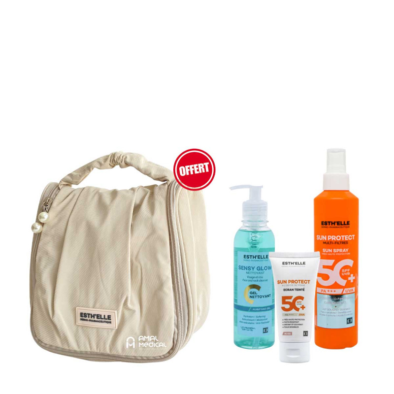 Ce pack exclusif Esth’Elle regroupe 3 soins incontournables pour prendre soin de votre peau sous le soleil, tout en la protégeant et la nettoyant en douceur. Il est livré avec une trousse de voyage offerte, spacieuse et ultra-pratique, idéale pour emporter vos produits partout, même à l'hôtel !