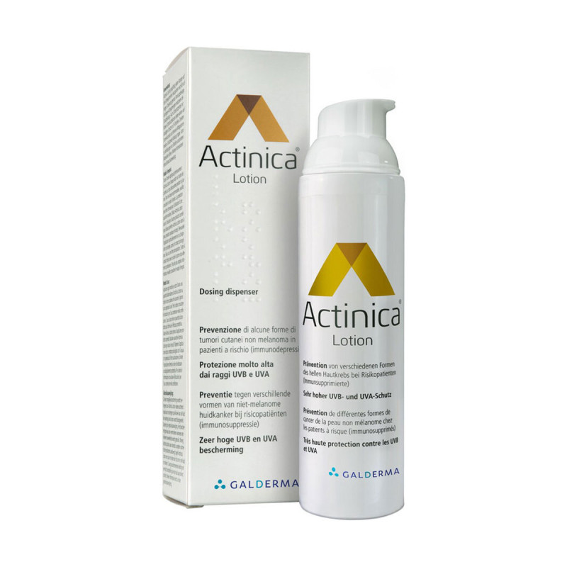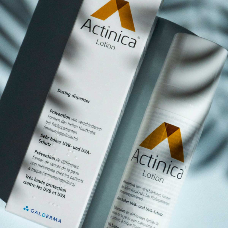 Actinica Lotion SPF50+ est un dispositif médical pour la prévention de différentes formes du cancer de la peau non mélanome chez les patients à risque (immunosupprimés). Il s'agit d'une très haute protection contre les UV.
