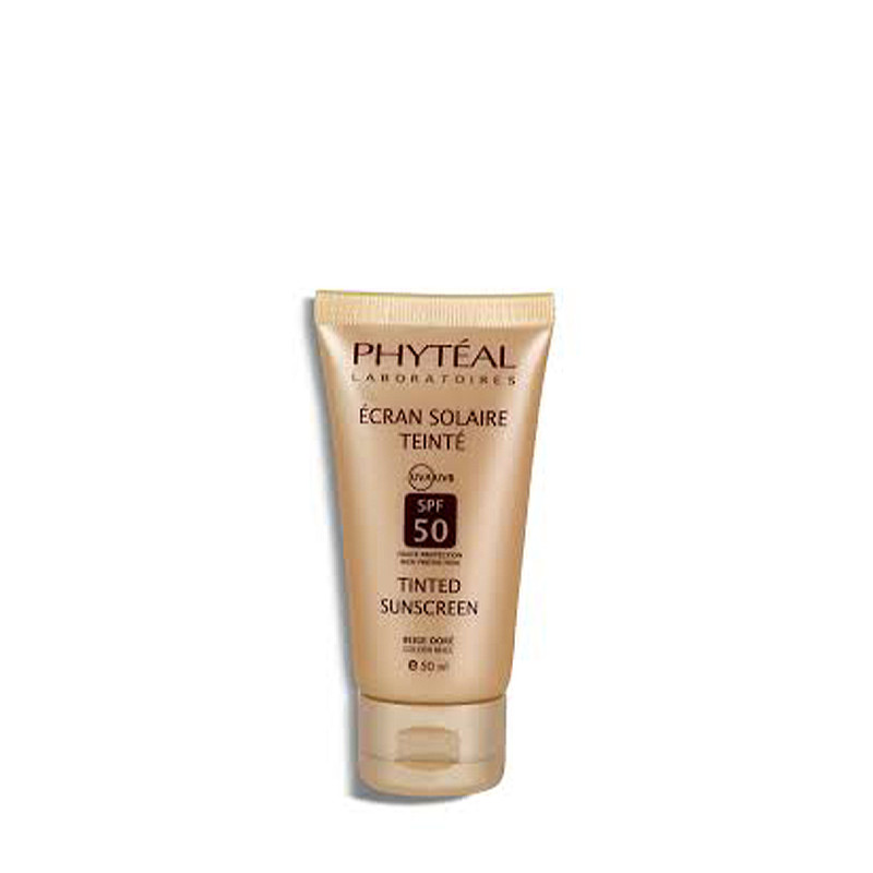 Phytéal écran solaire teinté beige doré SPF 50 UVA combine une protection solaire, un fond de teint et une crème hydratante. Hypoallergénique, sans parabène, résistant à l’eau, aux frottements et à la transpiration, il ne colle pas et ne présente pas d’effet masque.