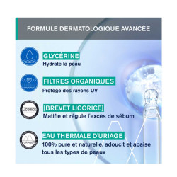 Ingrédients clés : Eau Thermale d’Uriage, Complexe filtrant anti UVA-UVB équilibré, Extrait de Réglisse, Agent matifiant.