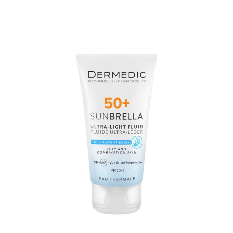 La Crème Solaire Dermedic Sunbrella Photostable et imperméable pour les peaux mixtes à grasses enrichie en Complexe de filtres UVA et UVB, Système de protection avancée, Extrait de romarin, Farfaraïde, Allantoïne, Glycérine, Eau thermale