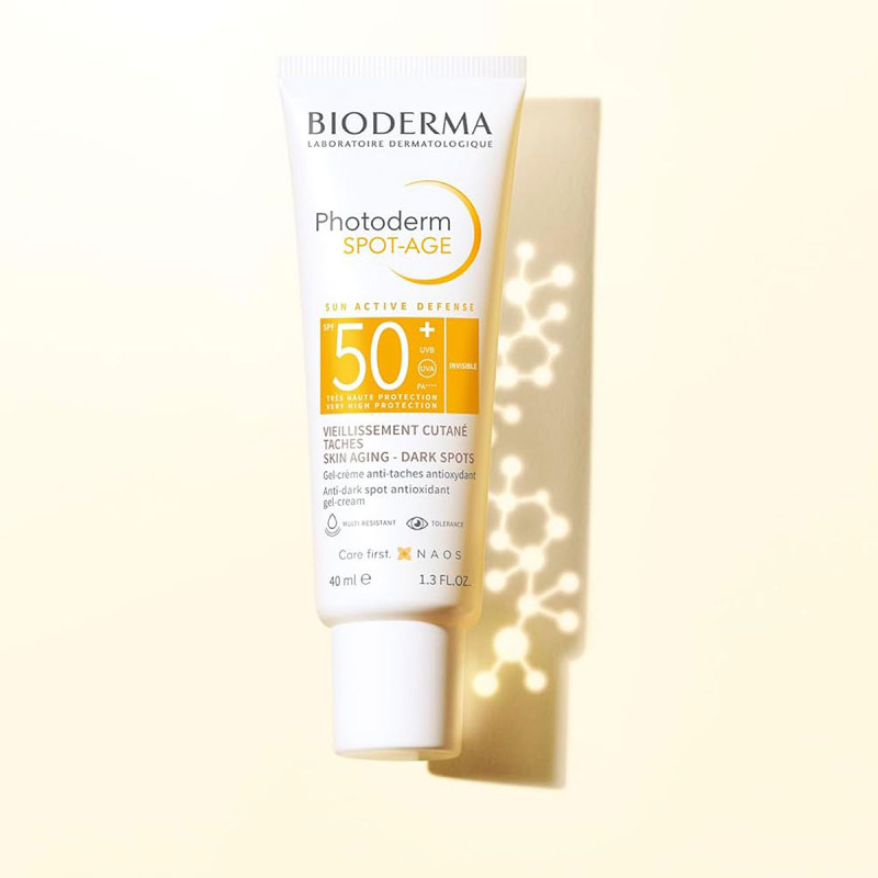 BIODERMA Photoderm SPOT-AGE SPF 50+ associe le pouvoir de 3 actifs reconnus par les dermatologues [Vitamine C - Vitamine E - Centella asiatica] et de filtres solaires pour une protection large spectre (UV - Lumière Visible - Infrarouges) et crée un soin qui prévient et favorise la réduction des signes visibles du photovieillissement (taches, rides, perte de fermeté).