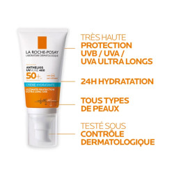 Pour une peau souple, confortable et lumineuse, la crème solaire peau sensible Anthelios UVMUNE 400 est enrichie en Glicérine actif humectant qui procure jusqu'à 24h d'hydratation et en eau thermale La Roche-Posay, apaisante et antioxydante.