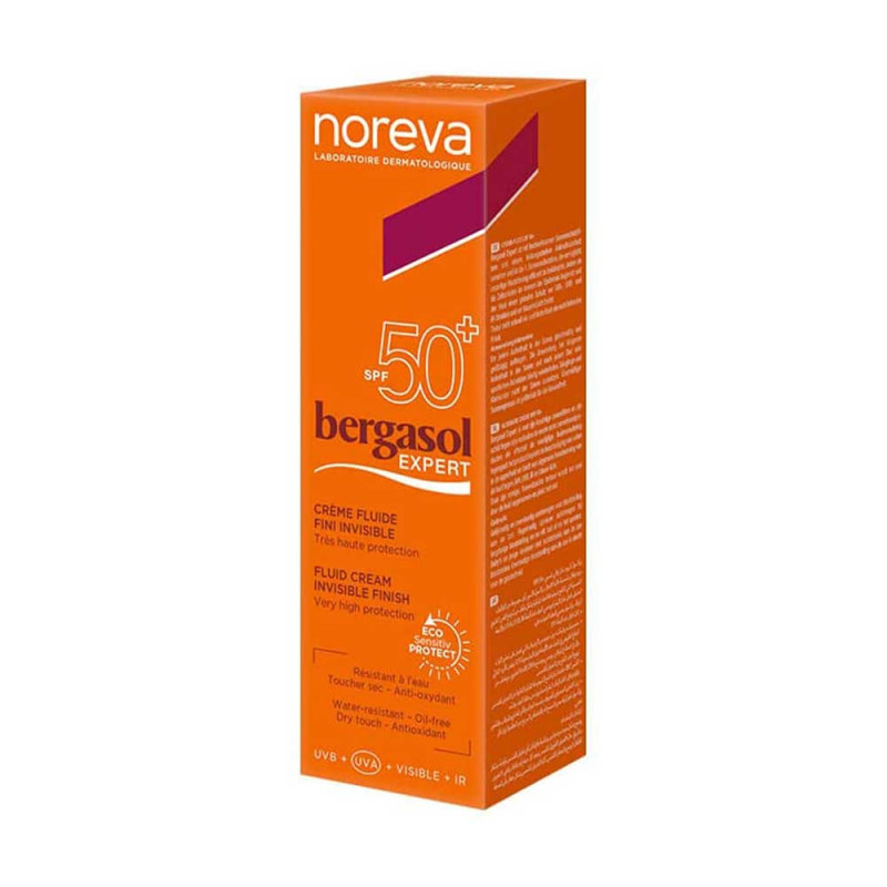 La crème fluide fini invisible de NOREVA BERGASOL composée d’un trio de filtres solaires, associé au sensitiv protect qui contient un peptide nouvelle génération, protège la peau des rayons UVA et UVB, de l’IR et de la lumière bleue en agissant sur la synthèse de la mélanine, la réparation de l’ADN des cellules cutanées et l’apaisement de la peau agressée par le soleil.