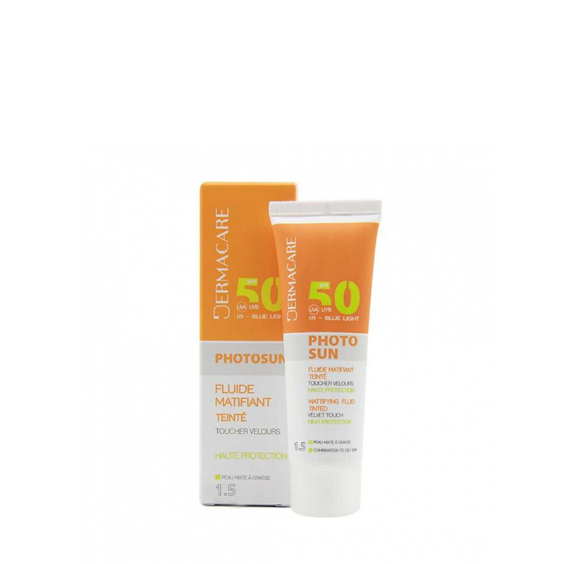Le Fluide Solaire Dermacare photosun matifiant et teinté à haute protection spf 50 qui protège la peau des UVA/UVB et des infrarouges. il protège et
