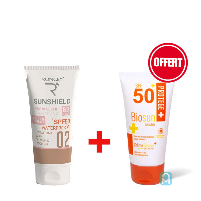 Pack solaire - Roncey Sunshield Crème solaire SPF50+ teinté 02 peaux sèches + Biosun Crème solaire SPF50+ invisible (offerte)