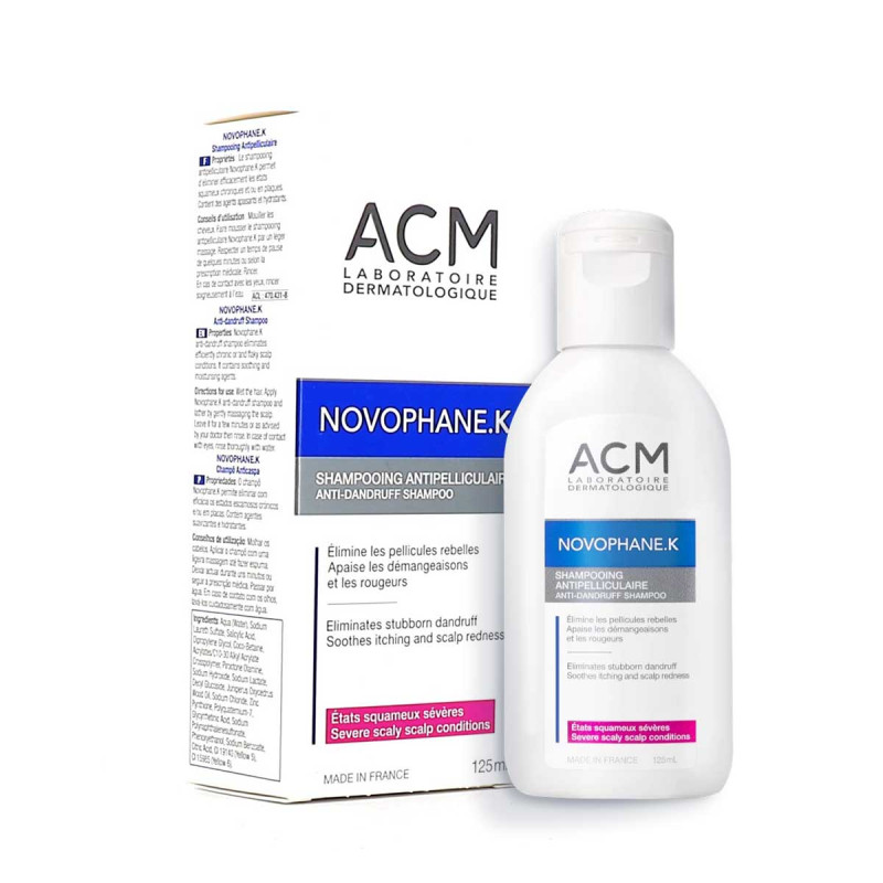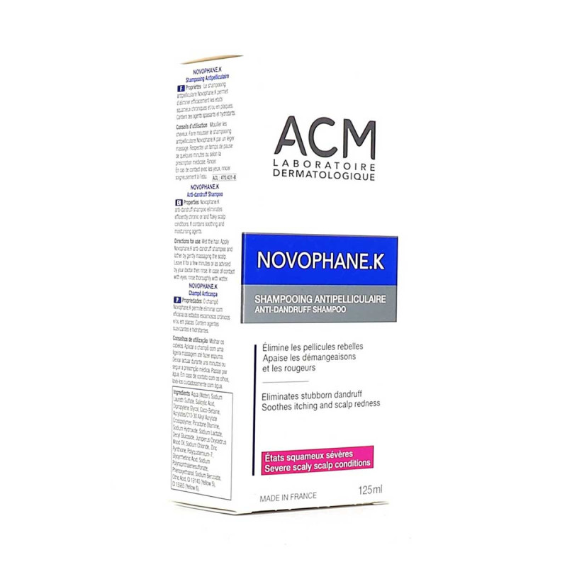 Novophane K est un shampooing antipelliculaire dermatologique formulé par le Laboratoire ACM, et qui s'adresse aux personnes souffrant d'états pelliculaires sévères qui engendrent des plaques, des démangeaisons et/ou des irritations.