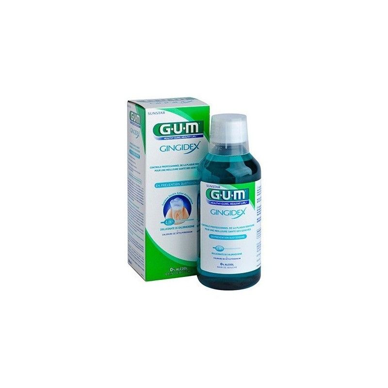 Grâce à sa formule antiseptique, le bain de bouche Gingidex de la marque Gum élimine efficacement les bactéries responsables de la plaque dentaire.