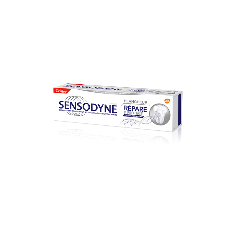Le nouveau dentifrice Sensodyne Répare & Protège Blancheur forme une couche protectrice solide autour des zones fragilisées de vos dents sensibles pour permettre une réparation renforcée.
