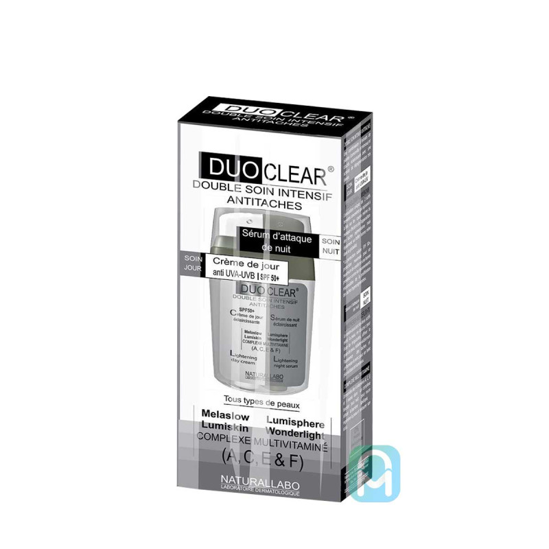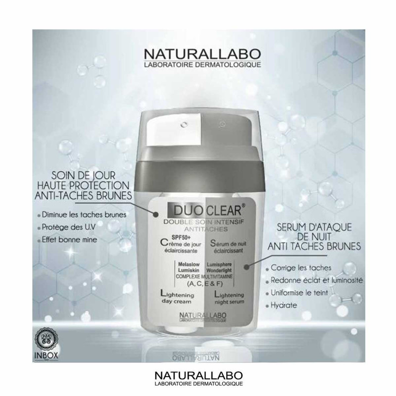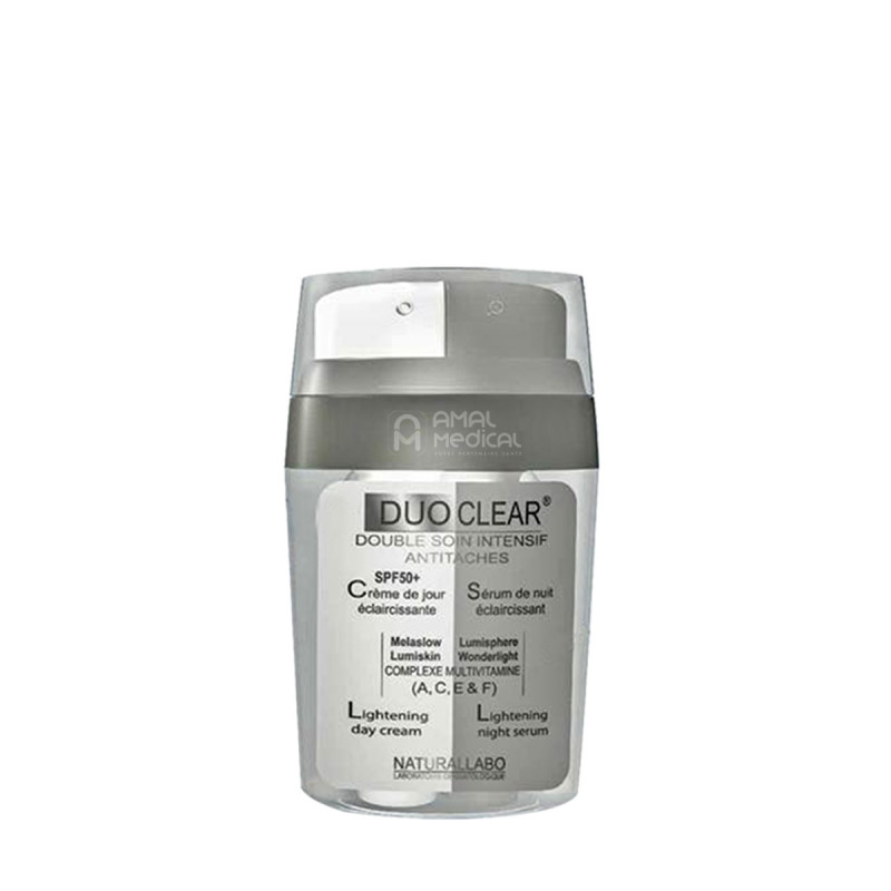 Duo Clear est un produit éclaircissant 2 en 1, un double soin intensif anti-taches brunes, vous n'aurez plus besoin de deux produits différents pour traiter vos taches d'hyperpigmentation, un flacon luxueux qui s'adapte parfaitement à la forme de votre main et qui glisse dans votre sac. Duo Clear est une combinaison entre une crème de jour éclaircissante avec une association d'actifs agissant sur les traces du manque d'éclat et de l’apparition des taches pigmentaires et un sérum d'attaque nuit pour exfolier la peau en douceur, lissant les irrégularités et en réduisant l'apparence des taches. Duo Clear pour un teint plus uniforme, éclatant et lumineux.