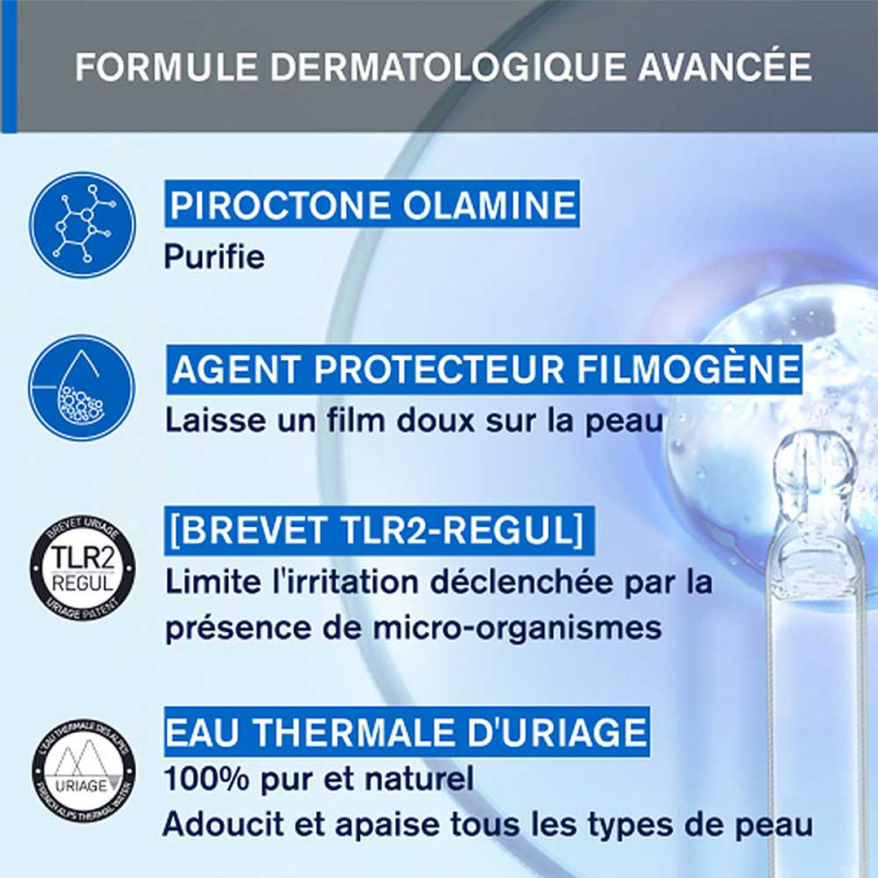 Sa technologie brevetée TLR2-Regul agit spécifiquement sur les sensations d’inconfort déclenchées par les micro-organismes, tandis que l’Eau Thermale d’Uriage (30%) calme et protège durablement la peau. Enrichi en tensioactifs doux et en agents surgraissants, il respecte l’équilibre cutané tout en apportant confort et souplesse.