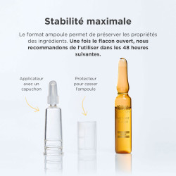 Appliquer ½ ampoule sur le visage et le cou en effectuant un léger massage jusqu’à absorption complète du produit.