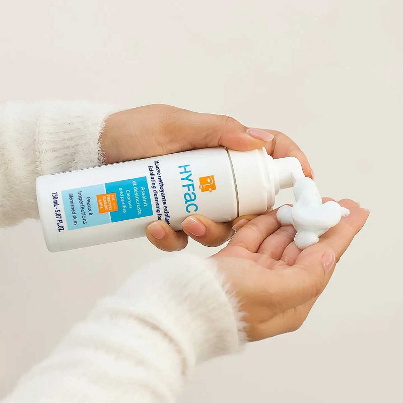 La mousse nettoyante exfoliante d'Hyfac est destinée pour les peaux grasses à tendance acnéique. Elle nettoie, purifie et désincruste en douceur.
