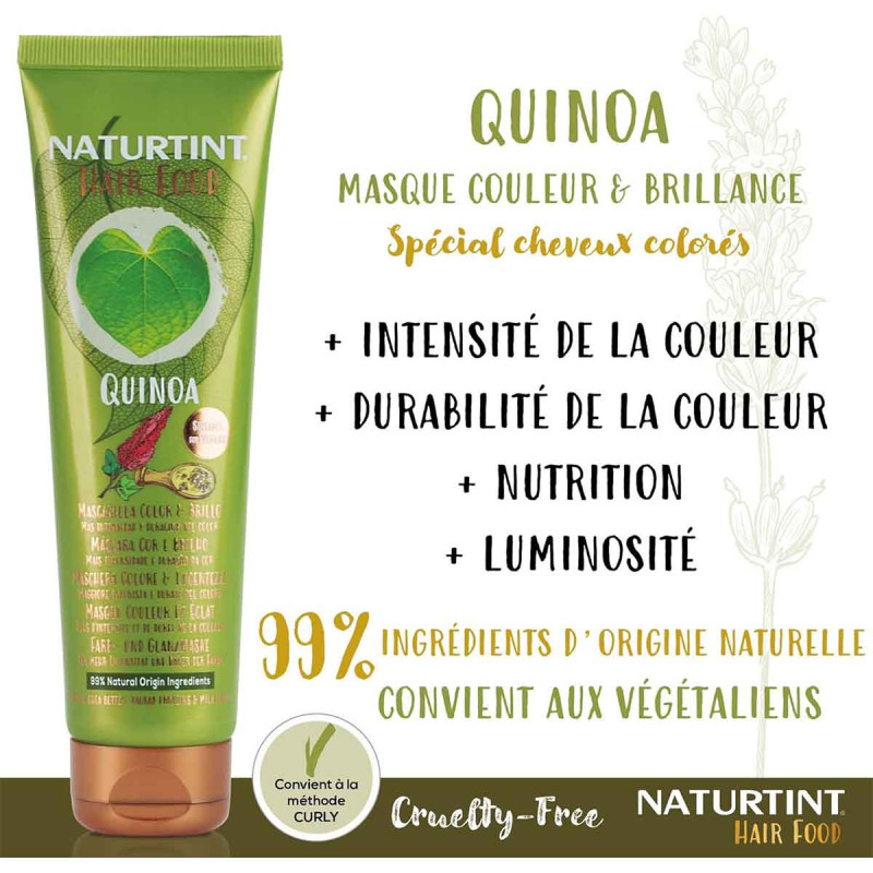 le Masque Hair Food au Quinoa de Naturtint est l’allié des cheveux teints et décolorés. Sa formule naturelle à 99 %, riche en superaliments, nourrit intensément et protège la couleur. Des cheveux plus brillants, plus doux, et une couleur qui dure !