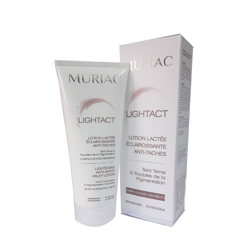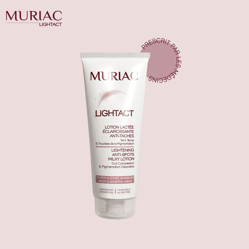 La lotion lactée éclaircissante anti-taches de Muriac Lightact s’applique sur le corps et les zones sensibles pour lutter contre le teint terne et les troubles de la pigmentation.