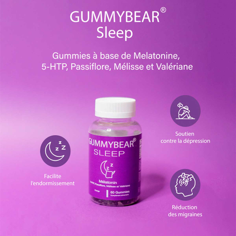 Gummybear Sleep est un complément alimentaire sous forme de délicieux gummies à mâcher, formulé pour favoriser l’endormissement, améliorer la qualité du sommeil et apaiser le mental. Grâce à sa synergie d’actifs naturels – mélatonine, 5-HTP, valériane, passiflore, mélisse – ce complexe doux vous aide à retrouver des nuits profondes, sans accoutumance ni effets secondaires.