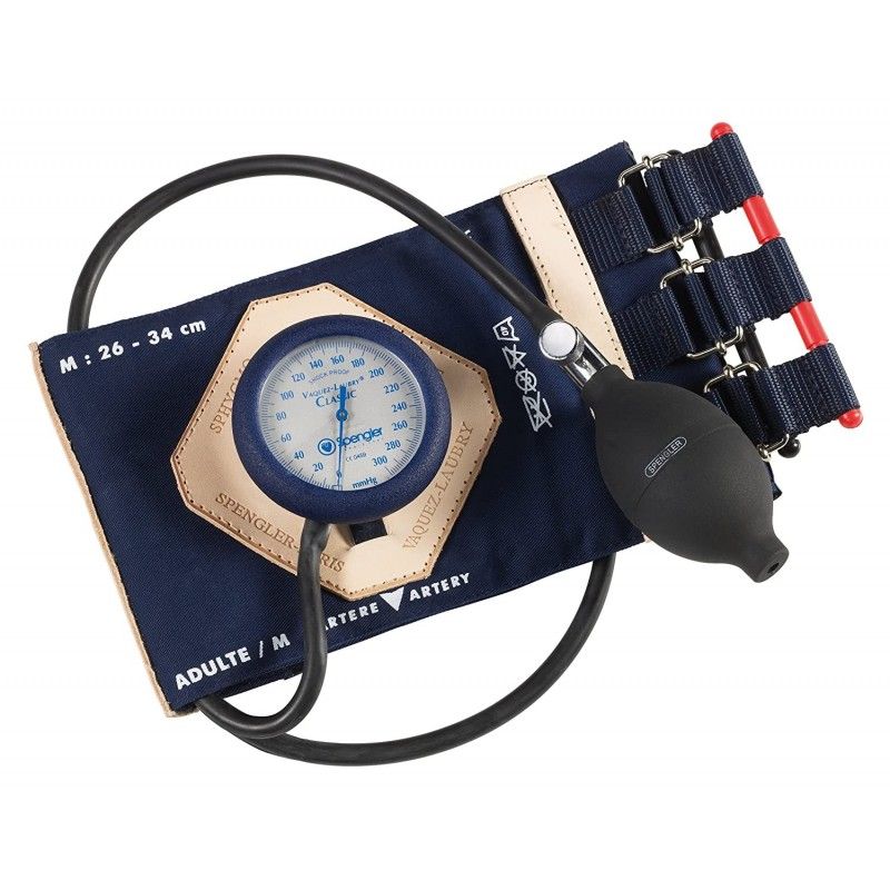 Manomètre au normes européennes (0-300mm/HG, sans vis de remise à zéro) avec protège cadran en mousse anti chocs. Ensemble mouvement/ membrane haute précision. Support de cadran en cuir pleine fleur (croûte de cuir pour vaquez laubry couleur). Ce tensiomètre a un brassard en Polycoton (avec bonnette de protection de poche pour brassard à sangles). poire "classic" (50 mm de diamètre) avec robinet de décompression en métal. Livré avec trousse de transport.