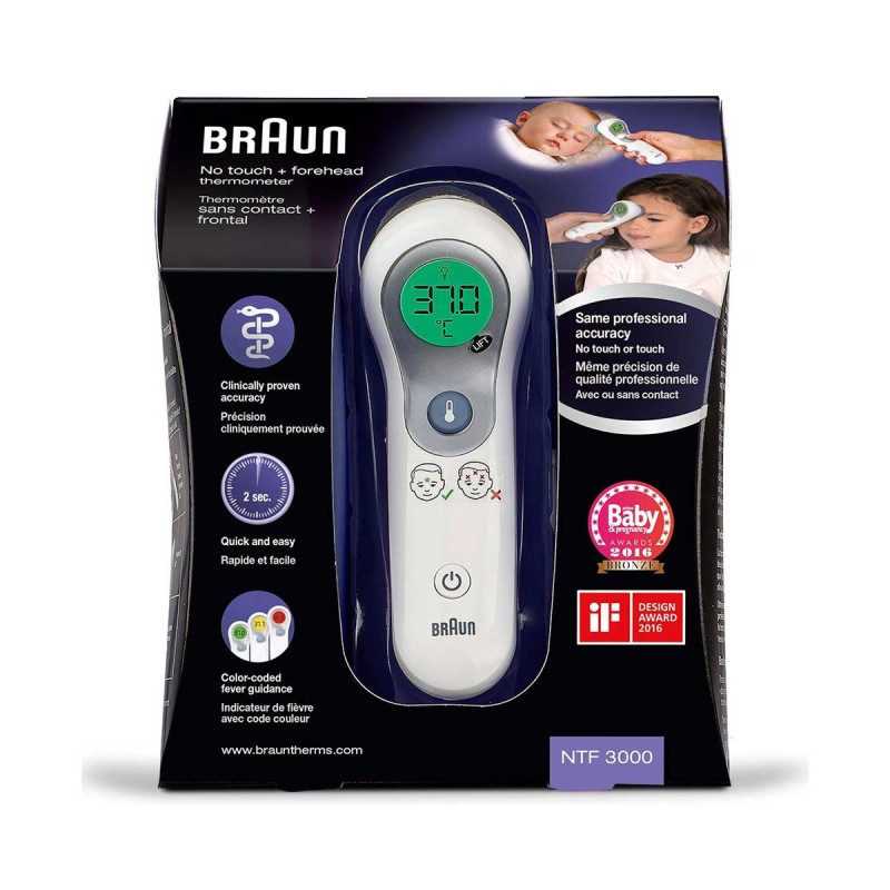 Découvrez le thermomètre frontal sans contact Braun NTF3000, l'outil idéal pour des mesures rapides et précises de la température. Pratique et hygiénique, il convient à toute la famille. Optez pour la fiabilité et la technologie avancée de Braun pour surveiller votre santé en toute simplicité.