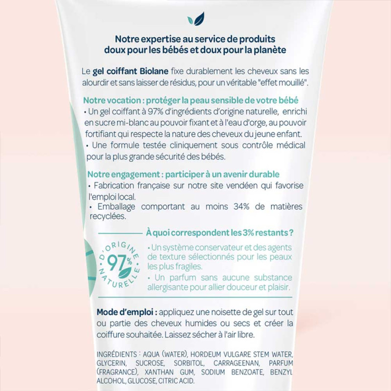 Envie d’une coiffure propre, stylée et adaptée à la chevelure délicate de votre enfant ? Le gel coiffant Biolane est spécialement conçu pour les bébés et jeunes enfants, dès la naissance. Enrichi en sucre mi-blanc à pouvoir fixant naturel et en eau d’orge fortifiante, il fixe durablement les cheveux sans les alourdir, sans coller ni laisser de résidus.
