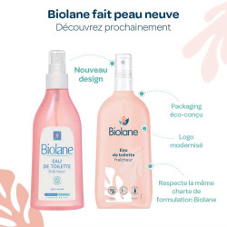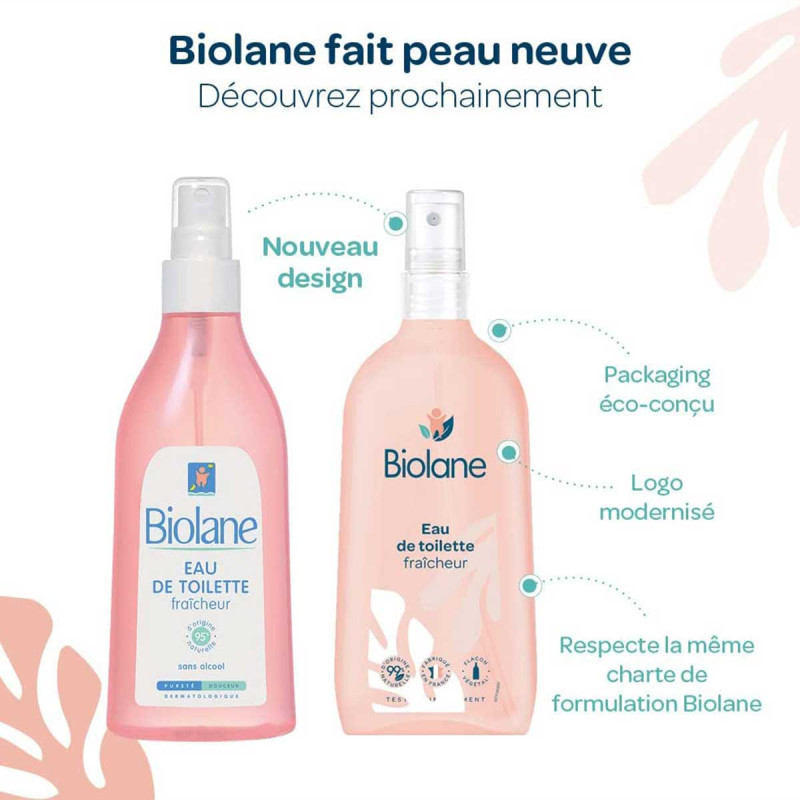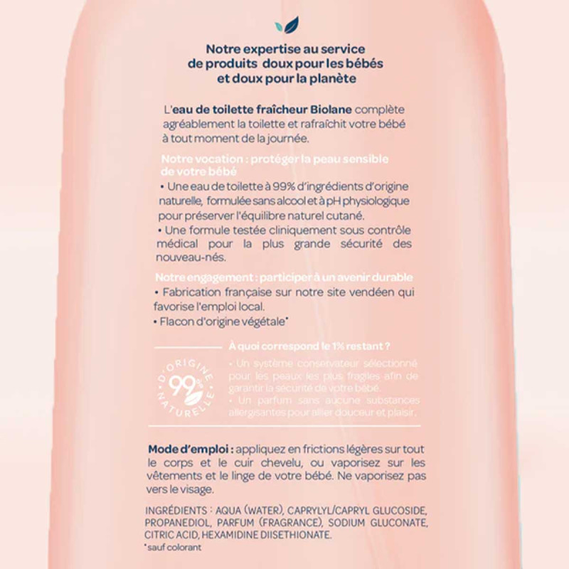 Formulée à 99% d'ingrédients d'origine naturelle, l'Eau de Toilette Fraîcheur Biolane complète agréablement la toilette et rafraîchit bébé à tout moment de la journée.