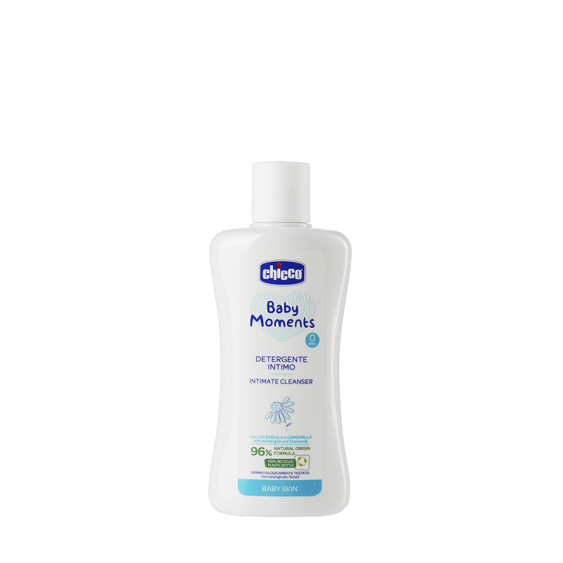 Formulé avec 96% d'ingrédients d'origine naturelle, le nettoyant intime de la ligne Chicco Baby Moments est enrichi en extrait de calendula et de camomille.